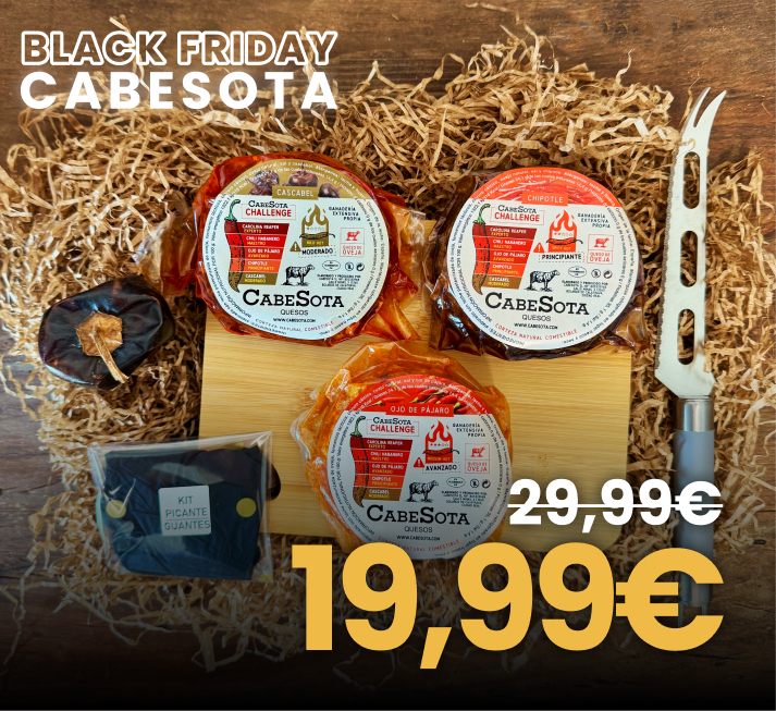Prueba nuestros últimos quesos para los más valientes. Este Black Friday te traemos un lote personalizable eligiendo los 3 quesos picantes que quieras probar. Junta nuestra calidad Cabesota con distintos níveles de picante, ¿hasta dónde te atreves a llegar?. Incluye: