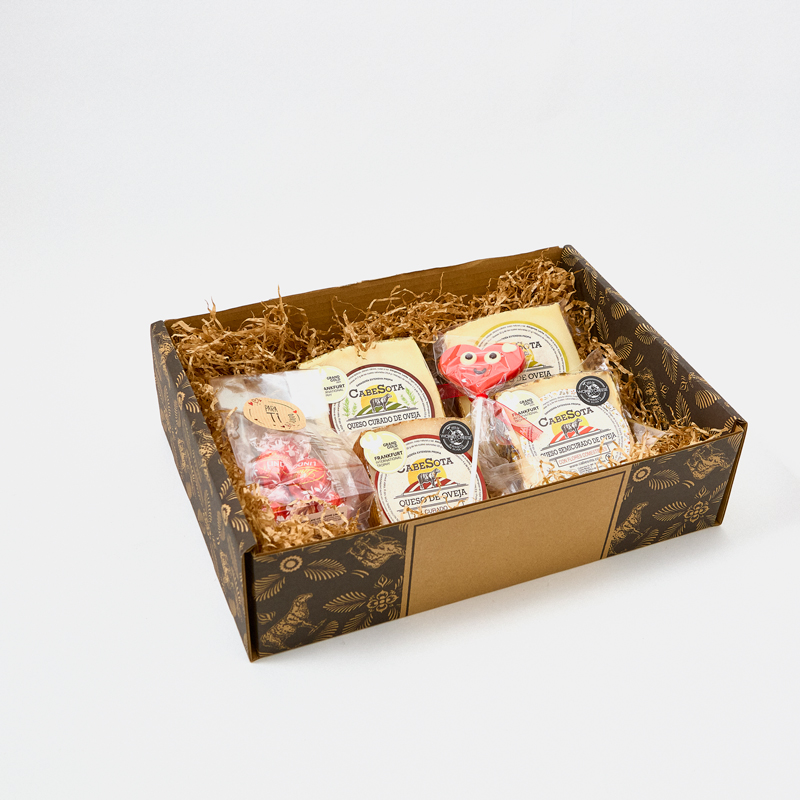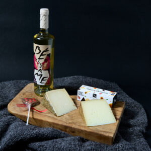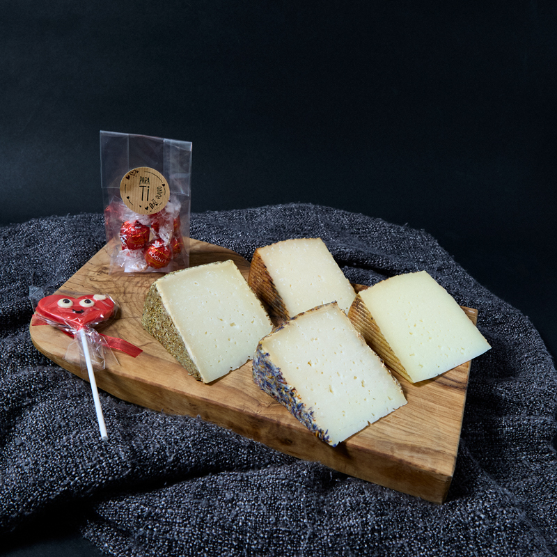 Incluye una selección de cuatro cuñas de queso (con flores, romero, semicurado y curado) que ofrecen una experiencia completa, desde sabores suaves hasta los más intensos. Una combinación perfecta para compartir y disfrutar sin prisas.