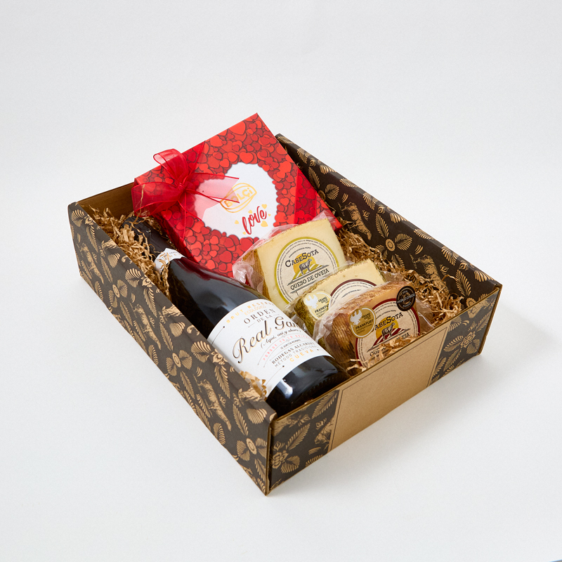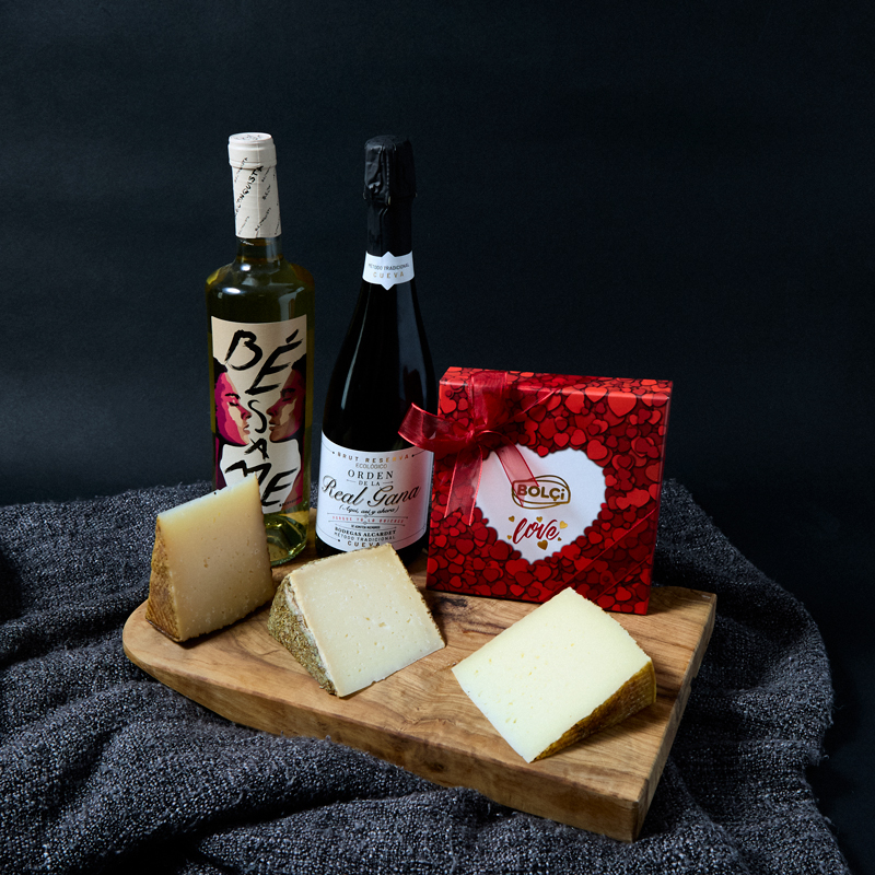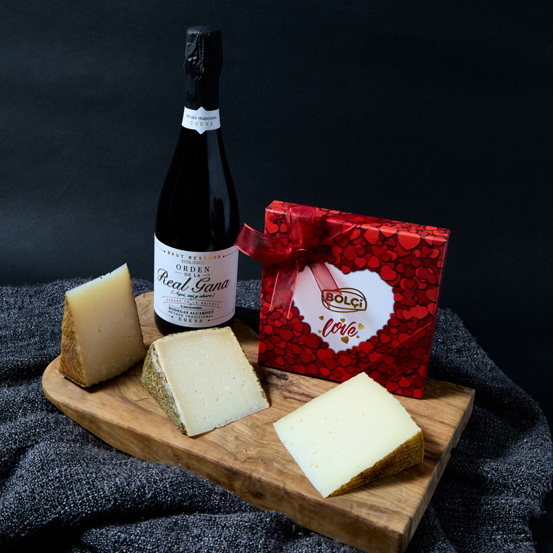 Incluye tres cuñas de queso artesanal —semicurado, curado y con romero— que ofrecen distintos matices y texturas, ideales para disfrutar en pareja. Se acompañan de cava Brut Real Gana, perfecto para brindar en un momento especial, y una caja de bombones que pone el toque dulce y romántico al final.
